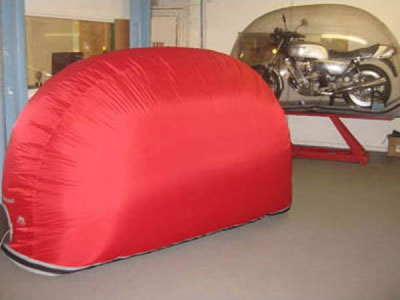 The Indoor Coded Bike Bubble has some differences, but is the same product and functions the same as the Indoor Clear Bike Bubble. The Indoor Coded Bike Bubble is the ultimate storage solution to store any motorcycle inside any garage or bike shop for a short or long time period. The Coded Bike Bubble's top cover is made from a lightweight, highly durable, non-see-through nylon material, as a single skin layer construction and the base mat is made from a PVC vinyl material, protecting the motorcycle from moisture, dust, dirt, scratches, dents, dings, kids, pets etc. This unclear, non-see-through indoor storage bubble provides 100% privacy, and no visibility to see the motorcycle inside the bubble. Once the top cover and base mat, is zipped up together and inflated, provide a protective, mini, safe, secure, clean and dustproof storage environment around the motorcycle. The built-in active airflow system, inflates the vinyl bubble, using one fan and 3 activated carbon filters to continuously circulate and filter the air inside the storage environment keeping the air clean and uncontaminated. The built-in drying vent is opened for 1 to 2 hours, creating a passive airflow across the bike, to ventilate inside the storage environment, releasing pollutants like moisture, hot oil and fuel vapors, heat, brake dust contamination etc., and also blow dry any water on bike and in storage environment. The fully automatic battery backup system, enables the airflow system to continue operating during a power failure for 72 hours without power, if needed. Once power is restored, the battery backup system automatically starts optimizing the bike battery. The battery backup system is designed to stay connected for a long time period to improve the life of the bike battery. The Bikebubble is equipped with a dedicated 12 Volt power supply (power & charger system), provide 12DC to power the airflow system and provide battery management to maintain the bike battery. This bike cover can be custom made to accommodate any motorcycles or trikes. The Coded Bike Bubble is for indoor use only. There are 2 sizes offered a short size and long size. The short bubble is made for all sport bikes up to the Honda CBX 1000. The long bubble is made for all big Harleys and fully dressed Honda touring bikes. There are 2 colors offered a regal red or royal blue. It takes 10 minutes to setup the Indoor storage bubble. A one year warranty comes with bike bubble. |