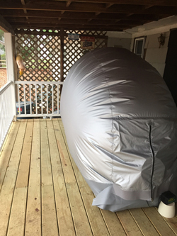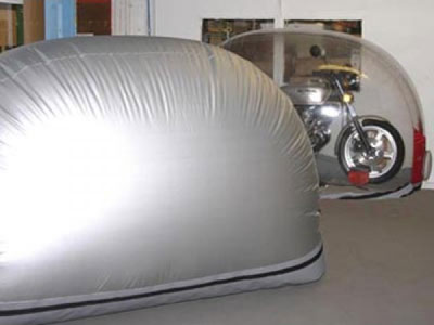 The Outdoor Bike Bubble is the ultimate storage solution to store any motorcycle outside for a short or long time period. The Outdoor Carcoon's top cover is made from a lightweight, highly durable, UV ray coated, non-see-thru nylon material, as a double skin layer construction, with an air gap in between each layer, and the base mat is made of a 3 layer, PVC vinyl, with insulation foam in between each layer, protecting the motorcycle from moisture, dust, dirt, heat, dew point, cold ground temperatures, UV rays and infra red light, kids, animals etc. The Outdoor Carcoon's top cover is also made as a single skin layer construction providing single skin layer protection only. This unclear, non-see-through nylon bubble provides 100% privacy, and no visibility to see the motorcycle inside the bubble. Once the top cover and base mat, is zipped up together and inflated, provide a protective, mini, safe, secure, clean and dustproof storage environment around the motorcycle. The built-in active airflow system, will inflate the nylon bubble, using one fan and 3 activated carbon filters to continuously circulate and filter the air inside the storage environment keeping the air clean and uncontaminated. The built-in drying vent is opened for 1 to 2 hours, creating a passive airflow across the bike, to ventilate inside the storage environment, releasing pollutants like moisture, hot oil and fuel vapors, heat, brake dust contamination etc., and also blow dry any water on bike and in storage environment. The fully automatic battery backup system, enables the airflow system to continue operating during a power failure for 72 hours without power, if needed. Once power is restored, the battery backup system automatically starts optimizing the bike battery. The battery backup system is designed to stay connected for a long time period to improve the life of the bike battery. The Bikebubble is equipped with a dedicated 12 Volt power supply (power & charger system), provide 12DC to power the airflow system and provide battery management to maintain the bike battery. This bike cover can be custom made to accommodate any motorcycles or trikes. The Outdoor Bike Bubble is for outdoor use only. There are 2 sizes offered a short size and long size. The short bubble is made for all sport bikes up to the Honda CBX 1000. The long bubble is made for all big Harleys and fully dressed Honda touring bikes. This bike bubble is offered in silver only. It takes 10 minutes to setup the outdoor storage bubble. A one year warranty comes with bike bubble. |