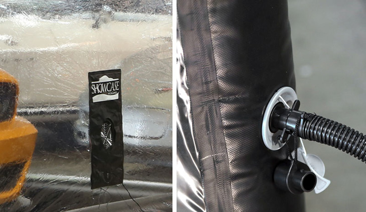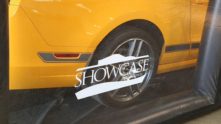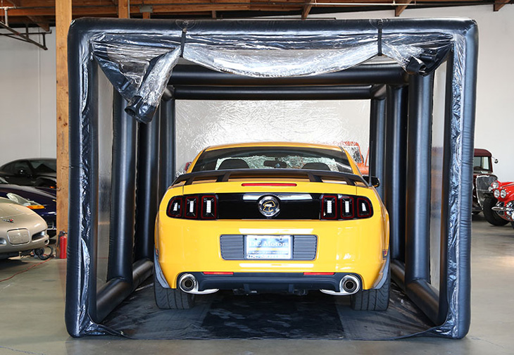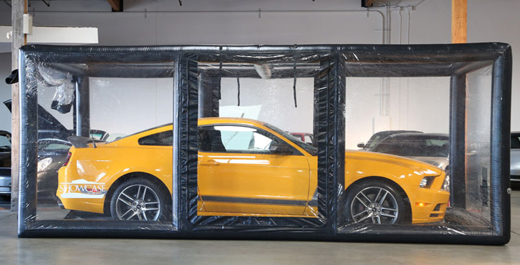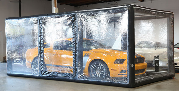 The Indoor ShowCase encapsulates and protects a vehicle 24/7-365 days a year from bad indoor conditions only. The Indoor ShowCase is an ultra-premium, free-standing, touchless car cover is the next evolution of CarCapsule™ technology. This Showcase is made for indoor use only, in most car shops, garages or storage facilities. A vehicle is stored in a dust free, dry; sterile, climate and pristine enclosed environment filled with pure air. Vehicles are protected from dings, dirt, dust, corrosion, mildew, musty odors, rust, fingerprints, pets, kids, nosy people, rodents, etc. The Deluxe Showcase maintains that “showroom shine” all-year-round for a vehicle stored inside. The Indoor ShowCase Storage System is larger in size and spacious inside than the Indoor CarCapsule to store a vehicle and one person can move around inside. The Indoor Car Showcase can be transported to another indoor storage location. Easily inflate and setup the ShowCase in about four (4) minutes. Simple setup, inflate Showcase, drive and park the car inside and then close. There are ten (10) Showcase lengths offered 10ft., 14ft., 16ft., 18ft., 18ft. Tall, 20ft., 20ft. Tall, 22ft., 22ft. Tall and 36ft. One year manufacturer warranty offered against all defects with workmanship and materials.