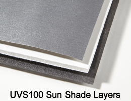 The UVS100 custom sun shade has a silver reflective fabric on the front side to block out the sun light, and a soft felt fabric on the backside to protect the surface of the interior. Both fabrics are laminated to a foam-core board which acts as an insulator.
