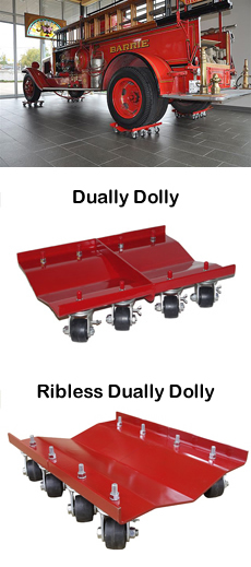 designed to manually move big trucks and trailers with rear dual wheels, in any direction, to park against a wall or in a corner, with ease, to free up floor space. It is recommended to use 4 or more people when moving vehicles with the dollies to avoid accidents. The Dually Dolly is made with a special reinforced design with center divider that captures the rear dual wheels, is made from super-strong 1/4" steel plate, with durable welded steel construction, has a red durable powder coated finish, and has eight (8) super-duty casters. There is also a Ribless Dually Dolly offered without center divider, that supports that same exact weight capacity, made and constructed from the same quality materials and offers all the same features as the Dually Dolly. All dually vehicle dollies, come with super-duty casters, supporting the weight capacity of 5200 lbs. per dolly; 10,400 lbs. per pair of 2 dollies; 20,800 lbs. per set of 4 dollies. The Dually Dolly dimensions are 24" wide x 16" long. The 24" wide dolly is used for heavy trucks and trailers with rear dual wheels. This car dolly is used in garages, service shops, body shops, restoration shops, car museums, showrooms, car shows, dealerships, storage facilities, aircraft hangers, etc. This car dolly can move automobiles, trucks, trailers, airplanes and many more heavy vehicles. These dollies are sold individually, or in any quantity needed. |